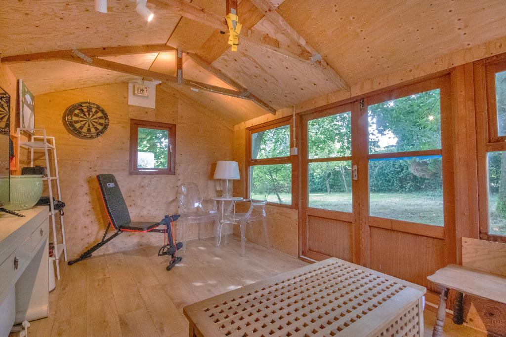 Set in just under half an acre, the gardens are cleverly laid out in compartments. In addition to a south-facing walled courtyard garden there are apple, eucalyptus, pine and birch trees with views over the adjoining countryside. A spacious summerhouse with mains power is ideal as a studio or home gym.