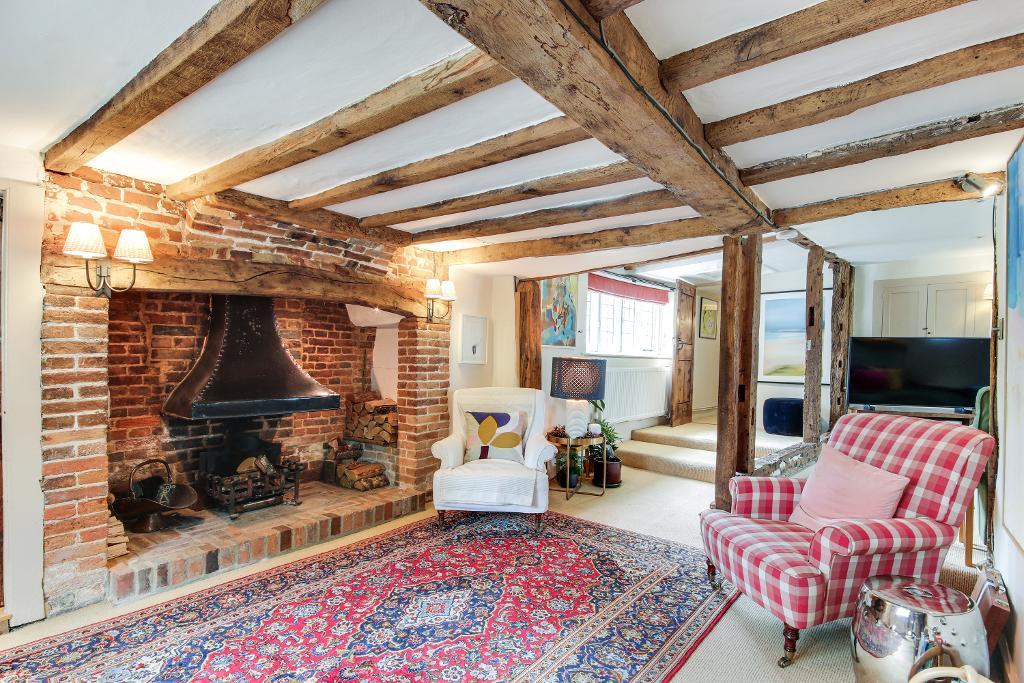 The sitting room with exposed beams and inglenook fireplace leads into the family room with wood-burning stove.