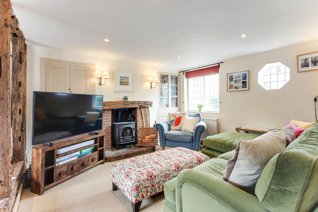 CHARACTERFUL KENTISH COTTAGE with oak beams, inglenook fireplace and four spacious double bedrooms, set in mature gardens with courtyard, summerhouse and views beyond. Includes a well-proportioned fitted home office with fibre broadband, ideal for hybrid working. Within walking distance of Goudhurst village and within the Cranbrook School catchment.